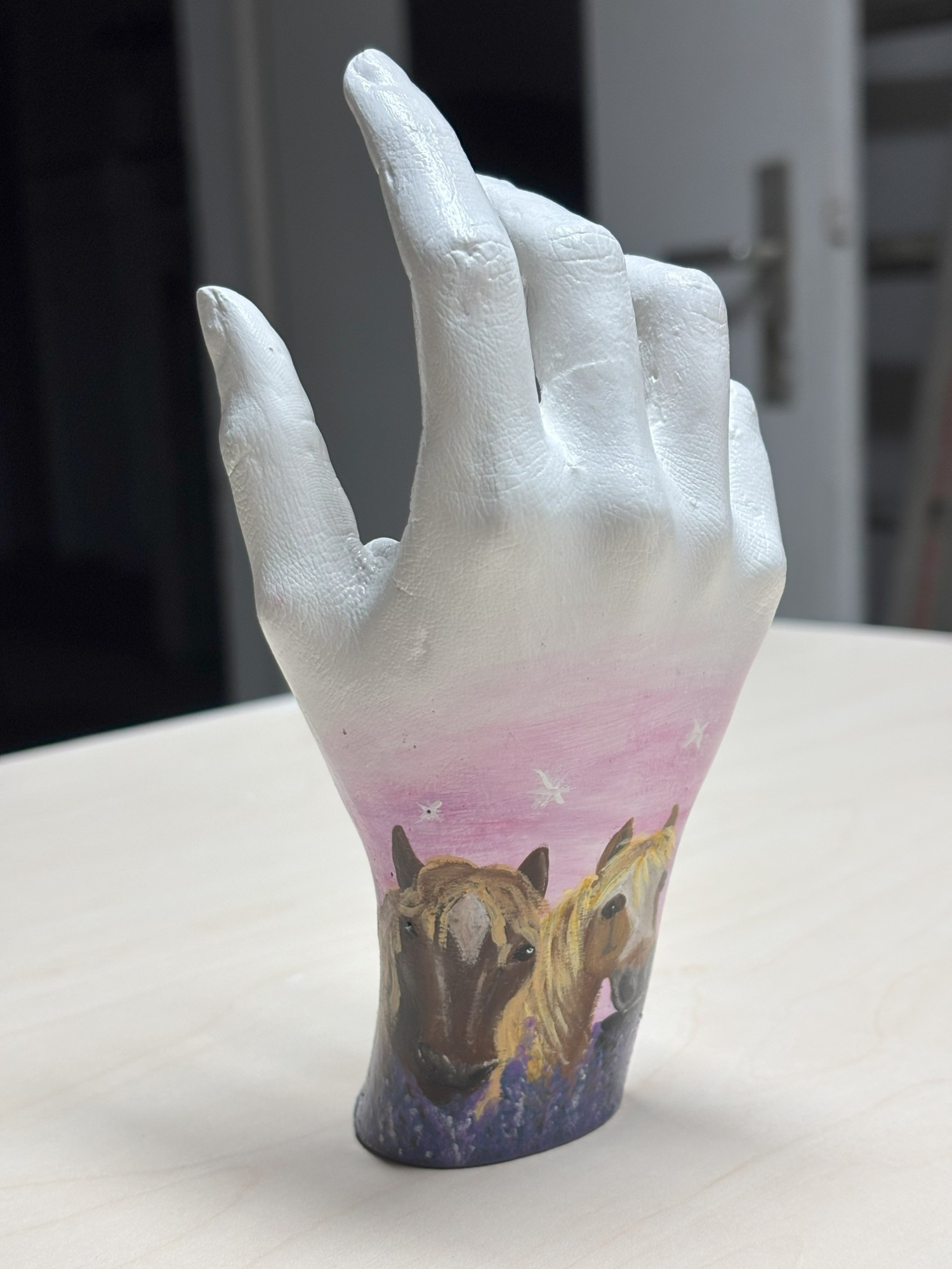 Auf den folgenden Bildern siehst Du schrittweise die Veredelung + Gestaltung eines Gipshandabdruckes. Es gibt meist ein paar kleine Luftbläschen oder Unebenheiten, die in der Veredelung behoben werden.
